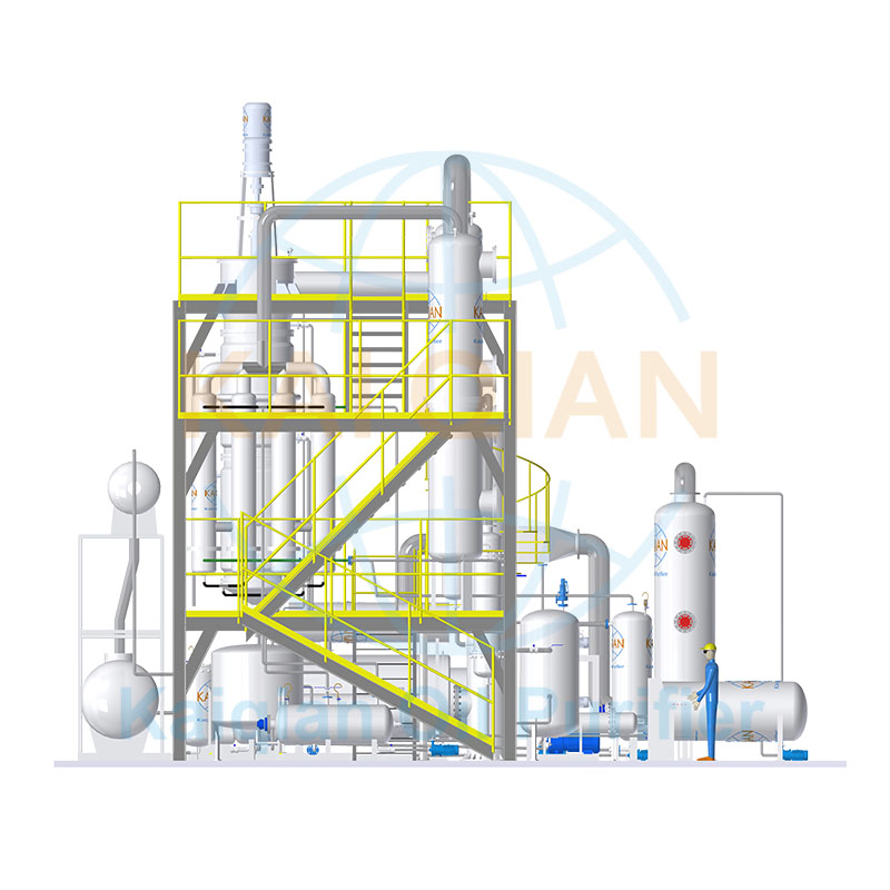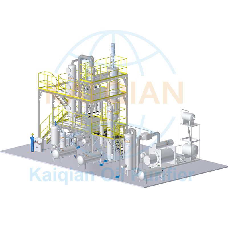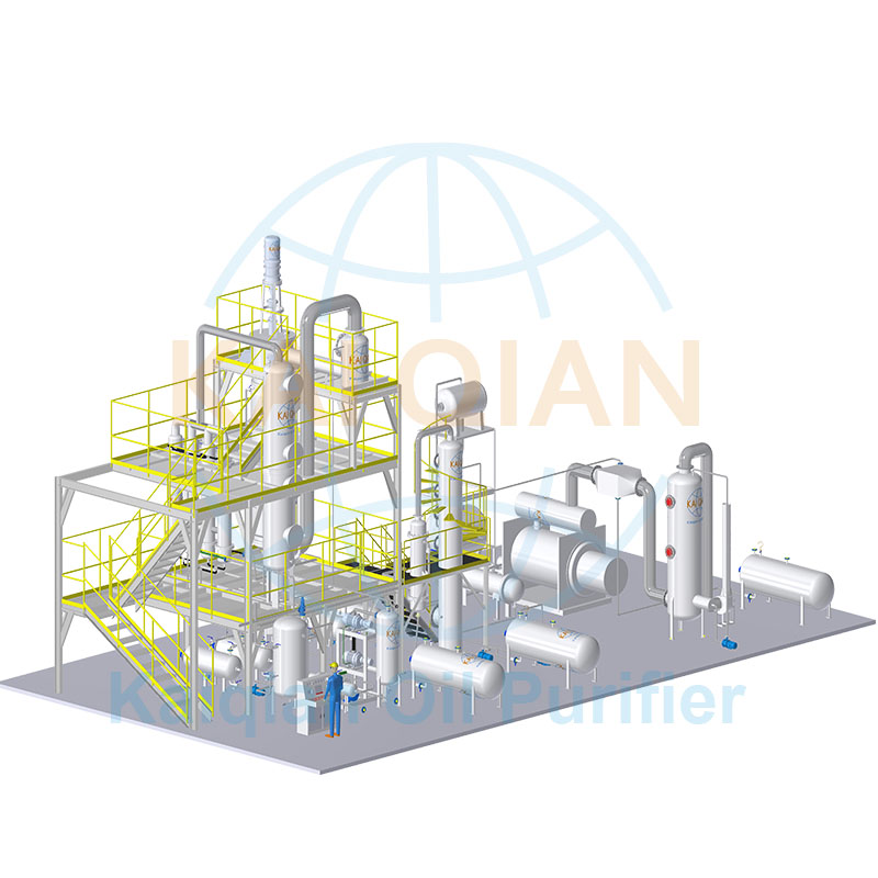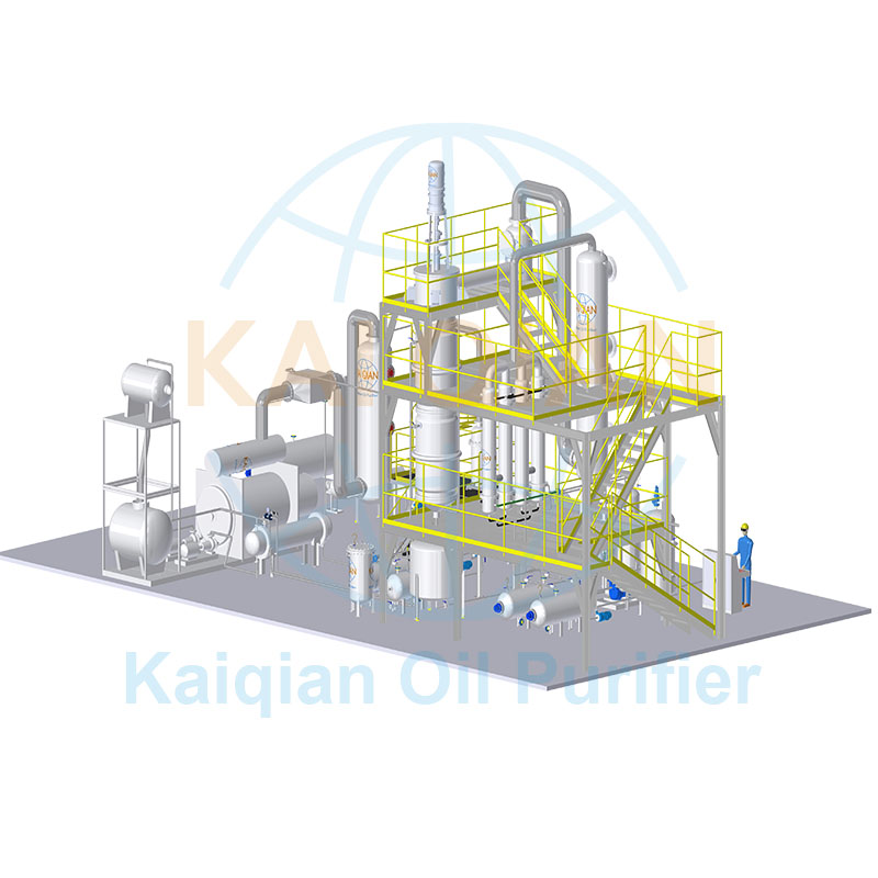 以廢舊輪胎、廢舊塑料熱裂解處理的固體垃圾回收油品再利用的技術(shù),已經(jīng)在世界范圍內(nèi)得到快速推廣,不但消除了部分固體白色垃圾對環(huán)境的污染,而且實現(xiàn)了能源的再生利用,但是廢輪胎、廢塑料熱裂解后的毛油,大部分應用是作為熱能燃料。因裂解過程中會產(chǎn)生炭黑,炭黑隨著油氣進入冷凝系統(tǒng),故油品顏色較黑,雜質(zhì)較多,且熱值不高,利用率較低;而少數(shù)采用簡單脫色沙對油品進行簡易處理,此技術(shù)處理精度較低,加工過程中油品損失嚴重,而且脫色沙過后的油品化學性質(zhì)不穩(wěn)定,極容易被氧化,造成油品顏色變黑,雜質(zhì)多,經(jīng)濟效益損失較大,可采用高真空精餾設(shè)備裝置對塑料輪胎毛油精煉提純得到更清潔透明的燃料油。